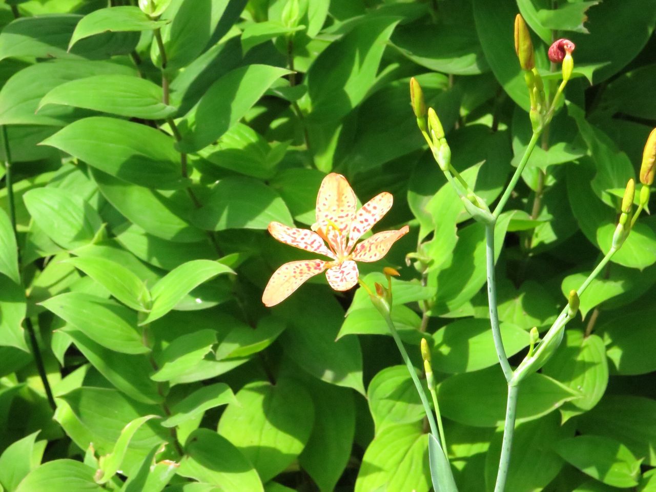 こちらは庭園入口近くで明るい色の花を咲かせていたヒオウギです。毎日蒸し暑いので皆様もどうぞ体調管理にお気をつけくださいね。