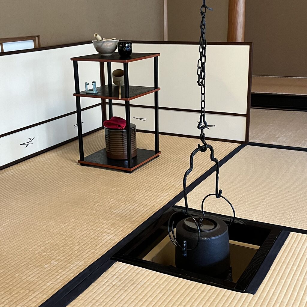 お稽古では前回に引き続き釣り釜を使って入子点を致しました。前回は更好棚でしたが今回は丸卓を使いました。あいにく写真を撮り忘れてしまったのでお見せすることができません。